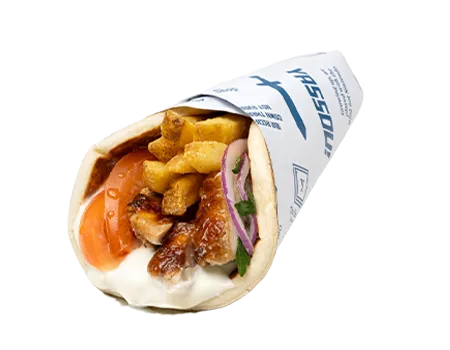 Kid-sized Yiros with Maryland chicken, chips, and tomato sauce – served as a combo with fries and a drink.