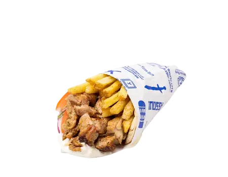 Traditional Greek Yiros on fluffy fresh pita, scorched lightly on the grill, filled with maryland chicken, ripe tomato, red onion, parsley, tzatziki and chips.