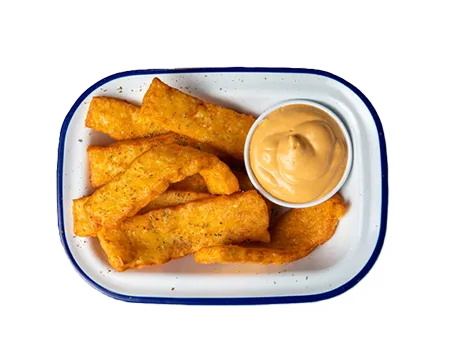 Slices of halloumi cheese, fried to a deep golden brown and served with our special sauce and a slice of lemon.