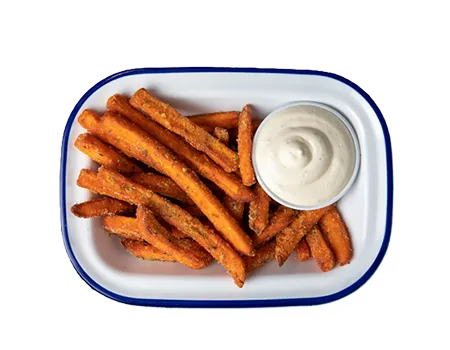 Crispy sweet potato chips with our classic chicken salt and a side of aioli