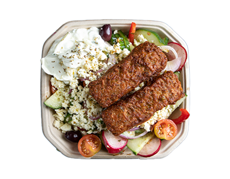 Traditional Greek Salad mix served with tzatziki, Two vegetarian patties & lemon olive oil dressing.